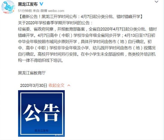 公告明确,经黑龙江省委、省政府同意,并报教育部备案,黑龙江省自2020年4月7日起分类分批、错时错峰开学。4月7日高中(中职)学校毕业年级全省同步开学;4月13日至17日初中毕业年级按照市域同步原则开学,具体开学时间由各市(地)自行确定。初中、高中(中职)学校非毕业年级及小学、幼儿园开学时间由各市(地)视情况自行确定。