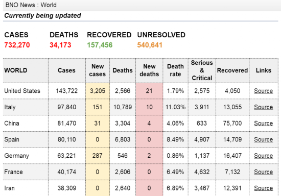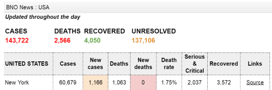 根据荷兰媒体BNO News最新发布的数据显示,美国纽约州新冠肺炎累计确诊病例已经超过6万例,达到60679例。此外,纽约州一个州的累计确诊病例也已超过法国(40174例)、伊朗(38309例)等国家。