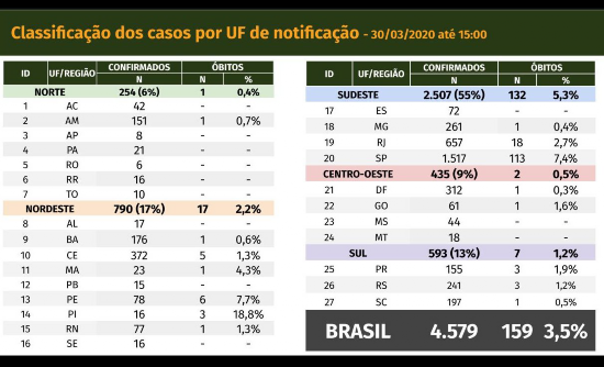 截至当地时间3月30日18时,巴西全国共确诊新冠肺炎病例4579例,比昨日新增323例,死亡病例159例,死亡率为3.5%。