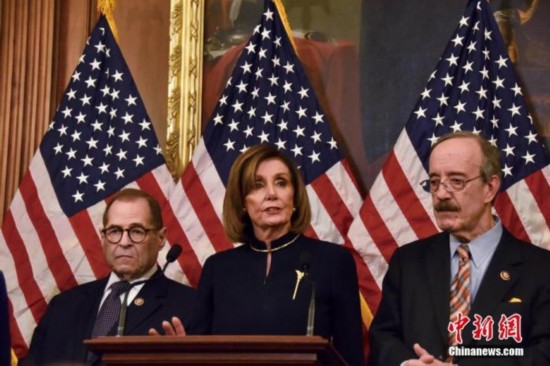 资料图:美国国会众议院议长佩洛西(中)。中新社记者 沙晗汀 摄