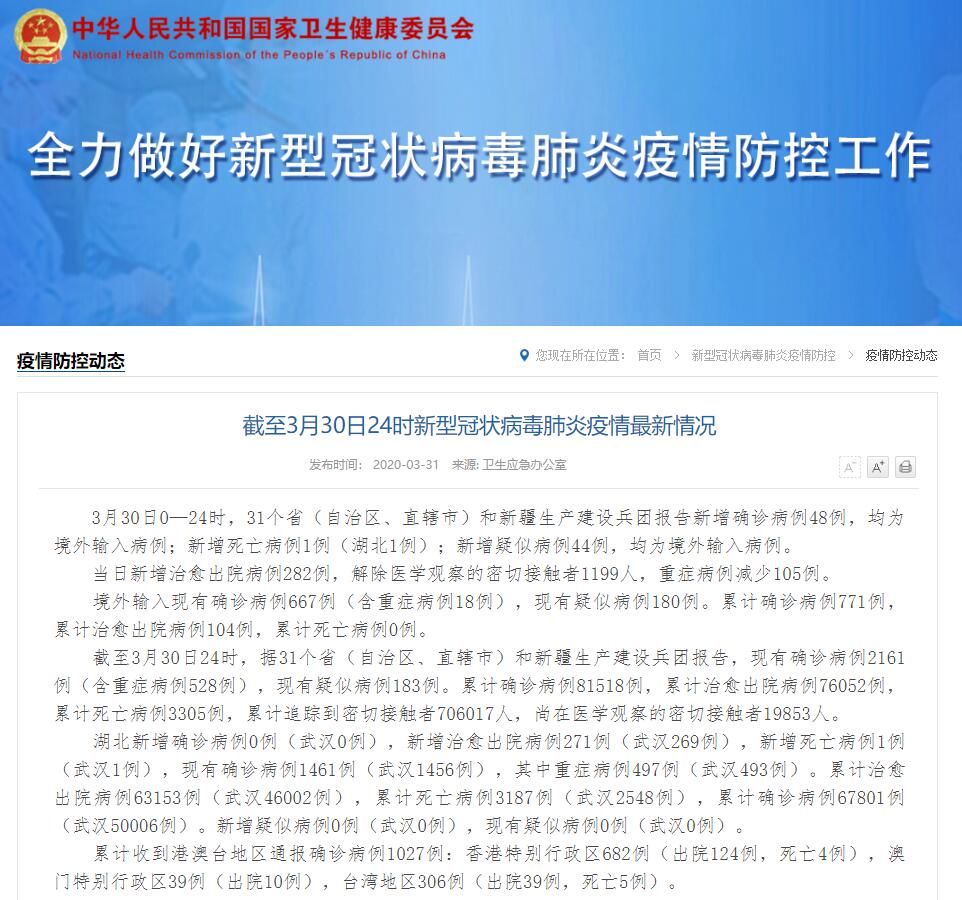 3月30日0—24时,31个省(自治区、直辖市)和新疆生产建设兵团报告新增确诊病例48例,均为境外输入病例;新增死亡病例1例(湖北1例);新增疑似病例44例,均为境外输入病例。