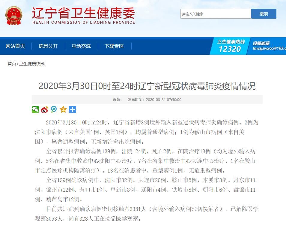 荔枝新闻讯 据辽宁省卫健委官网消息,2020年3月30日0时至24时,辽宁省新增3例境外输入新型冠状病毒肺炎确诊病例。2例为沈阳市病例(来自美国1例、英国1例),均属普通型病例;1例为鞍山市病例(来自美国),属普通型病例。无新增治愈出院病例。