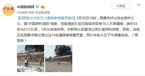 3月30日15时,西昌市泸山发生森林火灾。据“中国森林消防”消息,目前搜救队伍已陆续发现有19人不幸遇难,其中18名为打火队员,1名为当地向导。中新网从武警凉山支队宣传科获悉,目前,当地正在西昌市殡仪馆为这19名遇难者搭建灵堂,预计会在今日下午搭建完成。(杨雨奇)