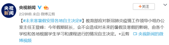 教育部应对新冠肺炎疫情工作领导小组办公室主任王登峰:今年假期延长,会不会造成对未来的暑假及寒假的影响,由各个学校和各地根据学生学习和课程进行的情况自主决定。