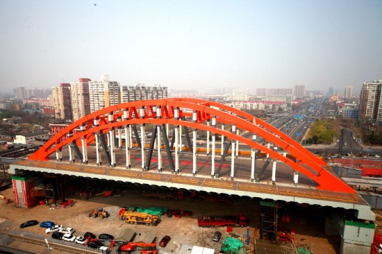 作为丰台火车站改建工程的一项,跨西四环的丰台特大桥为高速车场全线贯通的控制性工程。据了解,丰台特大桥位于丰台区正阳桥南侧50米处,桥梁总跨度112米,总宽度38.6米,桥上共铺设6条线路,为全国首座六线简支钢箱拱桥。