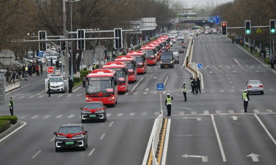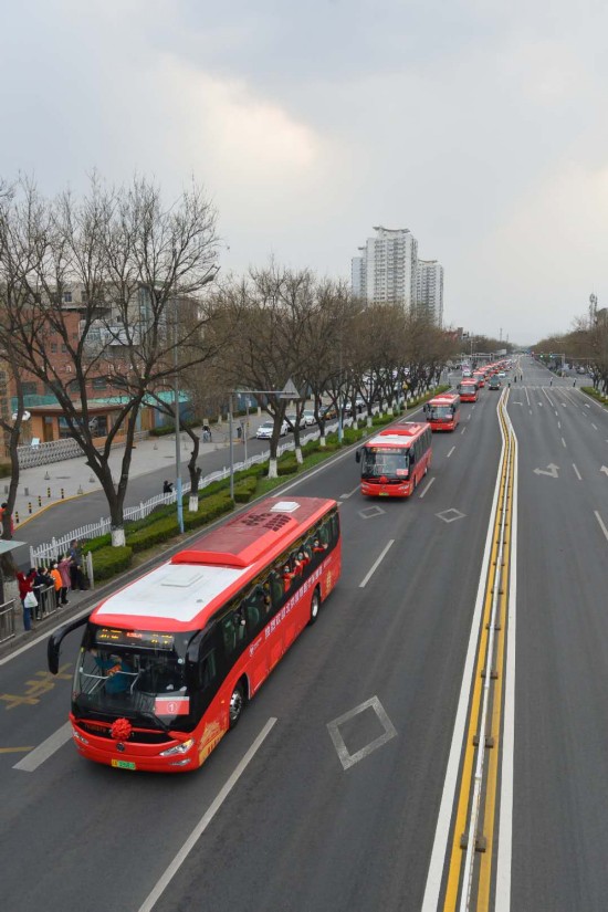 路口两侧站满了市民,纷纷驻足望向车队行驶方向,向大巴车内的北京医疗队队员挥手致敬,并用手机拍下这珍贵的瞬间。