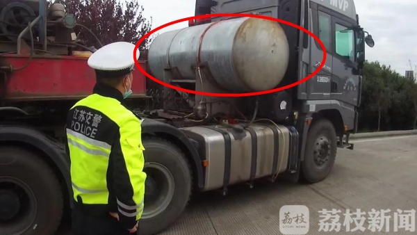 3月31日上午11点多钟,三大队民警在盐靖高速新兴服务区巡查时,发现一辆大货车的驾驶室后面横向固定了一个金属的油箱。面对询问,驾驶员刘某辩称,这辆车原来是跑新疆西北线的,因为疫情的原因,沿途不少加油站都关门了,为了避免半路缺油,这才加装了油箱。