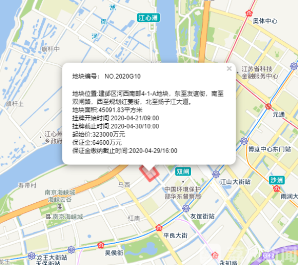 河西南G10地块(建邺区河西南部4-1-A地块),东至友谊街,南至双闸路,西至规划红菱街,北至扬子江大道。总用地面积45091.83㎡,出让面积45091.83㎡,用地性质为二类居住用地,容积率1.0<Far≤2.4,限高80米。起拍总价32.3亿,最高限价44.9亿元,起拍楼面价29847元/㎡,最高楼面限价41489元/㎡,竞买保证金6.46亿元。