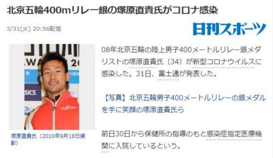 中新网4月1日电 据日媒报道,近日,日本短跑名将、北京奥运会男子4*100米接力银牌获得者塚原直貴感染新冠肺炎,他也是第一位感染的日本奥运奖牌获得者。