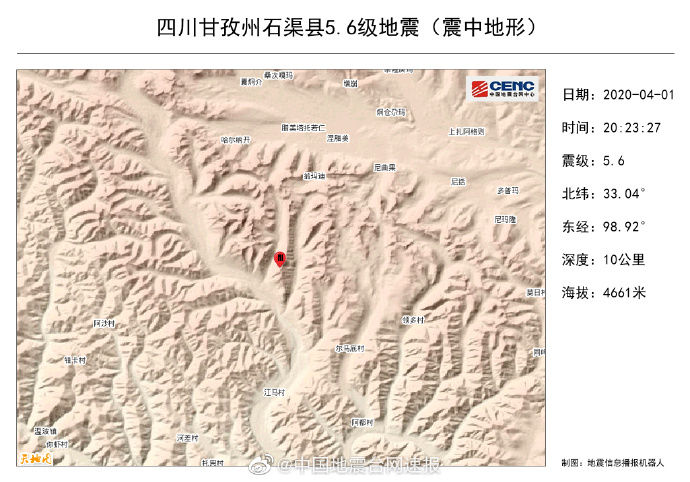 荔枝新闻讯 中国地震台网正式测定:04月01日20时23分在四川甘孜州石渠县(北纬33.04度,东经98.92度)发生5.6级地震,震源深度10千米。
