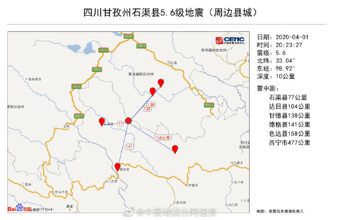 四川石渠5.6级地震震中距石渠县77公里、距青海达日县104公里、距青海甘德县138公里、距德格县141公里、距色达县158公里,距青海玉树179公里,距四川康定441公里,距西宁市477公里,距成都市559公里。