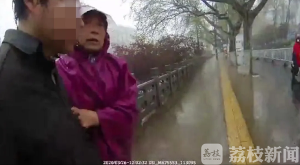 3月26日上午11时许,大雨滂沱中,镇江市区运河路220公交站对面,润州公安分局宝塔路派出所警车刚停下来,一名热心大姐就把一名中年男子交给民警。