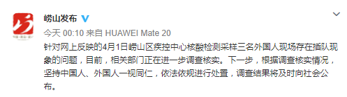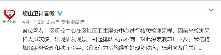 此前,@崂山卫计官微曾回应称因前来检测采样人员较多,出现插队现象,引起排队人员不满,对此深表歉意!
