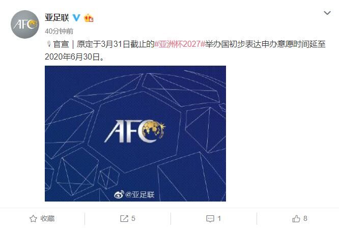 荔枝新闻讯 据亚足联官方微博4月2日消息,原定于3月31日截止的亚洲杯2027举办国初步表达申办意愿时间延至2020年6月30日。