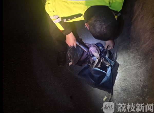 当天凌晨1点多,宿迁市交警支队高速一大队民警,在京沪高速沭阳辖区巡逻时发现中间行车道上有一团异物,走近一看才知道,原来是一个被车辆数次碾压至瘪掉的手提包。据宿迁市交警支队高速一大队一中队中队长翟健介绍,当时他们把包翻开以后,看到里面还有个小包,里面有银行卡,被碾碎了好几张,还有暂住证,以及失主本人的名片,随后民警打电话和失主联系。