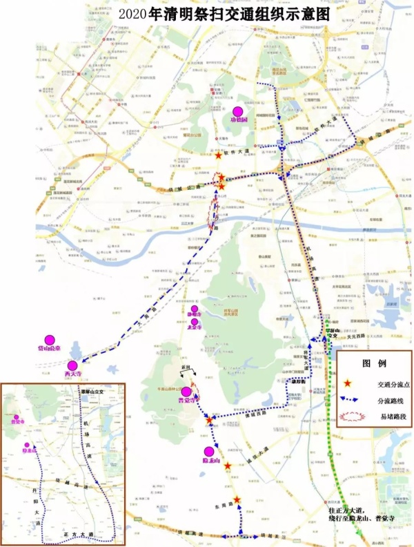 为了保证清明期间有序祭扫,昨天下午,南京交警发布清明祭扫出行提醒:清明节期间,开车前往普觉寺、隐龙山、祖堂山扫墓车辆从机场高速通行,避免进入易拥堵的宁丹路。宁丹路一线禁止大货车、教练车、农用车向墓地所在方向行驶,原持有白天运输通行证的渣土车禁止通行。 雨花功德园旁的花神大道、西天寺旁的大周路禁止车辆停放,前往其他墓园祭扫的车辆,统一进入墓园停车,交警将根据流量变化,适时安排车辆临时停放。