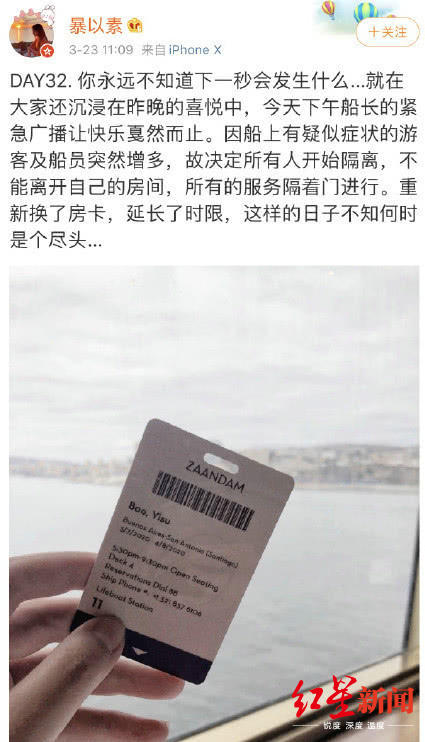 微博显示,因船上出现多起疑似病例,3月23日,暴以素被要求在邮轮房间里进行自我隔离。3天后,暴以素感觉自己也出现了一些状况,“继2天咳嗽之后,又开始发烧,体温在37.6-38.1℃”。