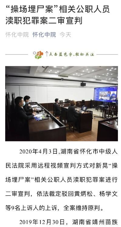 荔枝新闻讯 据怀化市中级人民法院官方微信消息,2020年4月3日,湖南省怀化市中级人民法院采用远程视频宣判方式对新晃“操场埋尸案”相关公职人员渎职犯罪案进行二审宣判,依法裁定驳回黄炳松、杨学文等9名上诉人的上诉,全案维持原判。