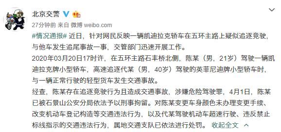 陈某在驾车时存在“追逐竞驶”行为,且造成交通事故,涉嫌危险驾驶罪。4月1日,陈某已被石景山公安分局依法予以刑事拘留。
