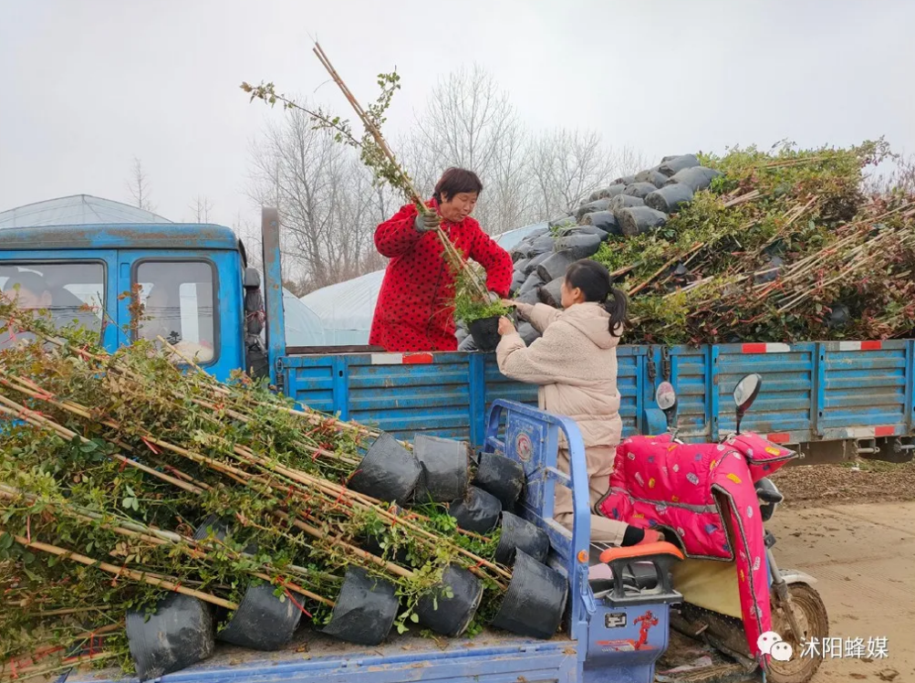 桑墟镇条河村农民将榆叶梅苗抬出田间,准备销往外地