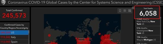 据美国约翰斯·霍普金斯大学发布的最新实时数据显示,截至北京时间4月3日15时30分,美国新冠肺炎死亡病例超6000例,达6058例。