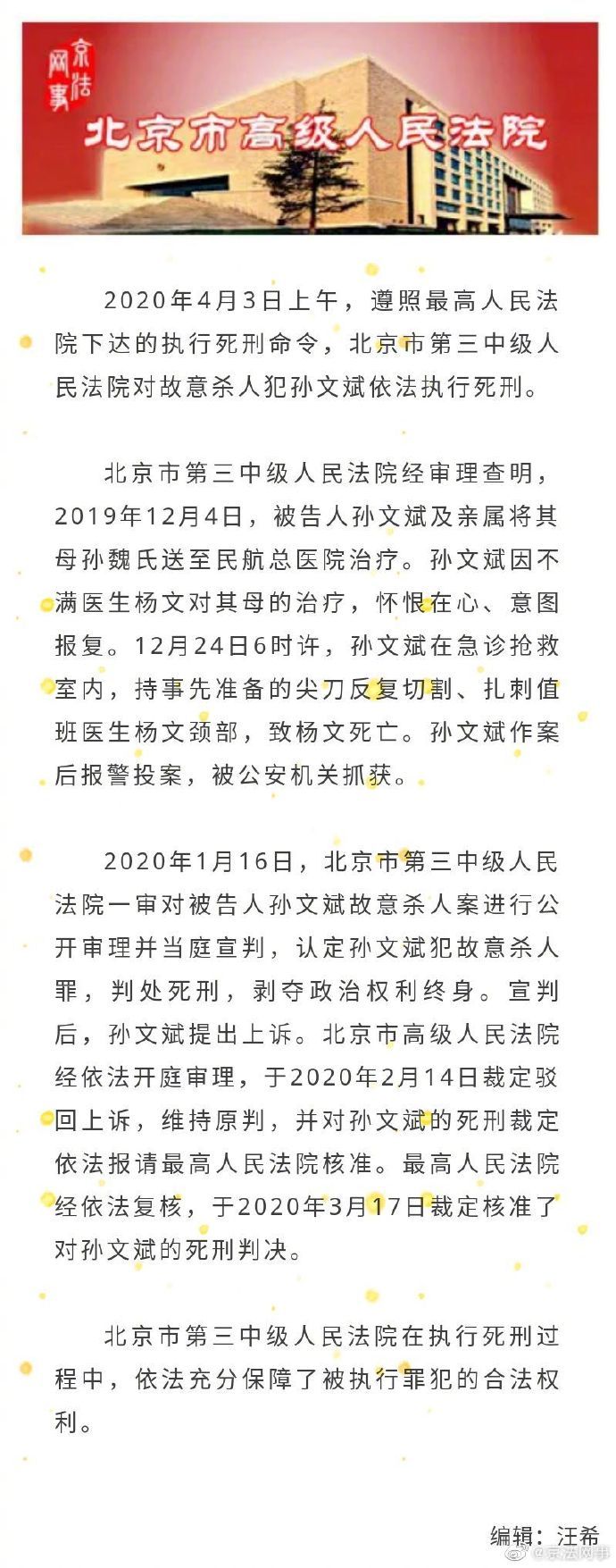 荔枝新闻讯 据北京法院网官方微博 @京法网事 通报:2020年4月3日上午,遵照最高人民法院下达的执行死刑命令,北京市第三中级人民法院对故意杀人犯孙文斌依法执行死刑。