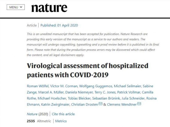 4月1日,《自然》杂志在线发表了一篇题为《新型冠状病毒肺炎住院患者病毒学评估》的论文。德国科学家克里斯钦·特劳森(Christian Drosten)和他的团队对一批慕尼黑的新冠肺炎住院患者样本进行了分析,论文详细介绍了患者体内新冠病毒的病毒学特征。