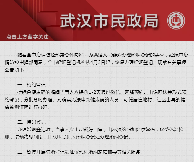据武汉市民政局消息,随着全市疫情防控形势总体向好,为满足人民群众办理婚姻登记的需求,经报市疫情防控指挥部同意,全市婚姻登记机构从4月3日起,恢复办理婚姻登记。详情>>