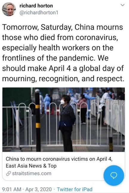 英国医学期刊《柳叶刀》主编理查德·霍顿3日发帖,肯定中国方舱医院在遏制病毒传播上的有效成就,同时他倡议,国际社会和中国公众一起,为新冠肺炎死亡病患 、特别是因公殉职的医护人员默哀致敬,使四月四日成为全球哀悼日。