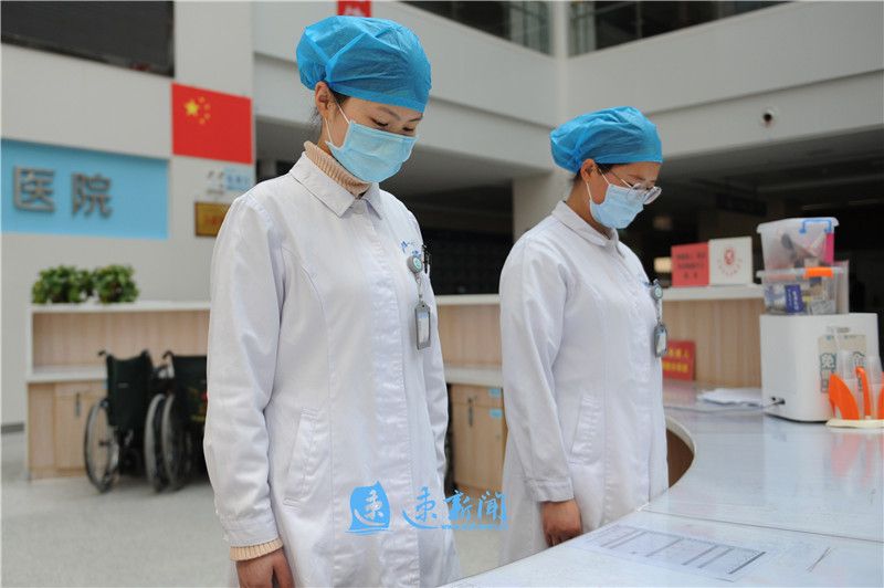 在宿迁市第一人民医院,医护人员沈晶晶和周瑛低头默哀、眼含泪花。