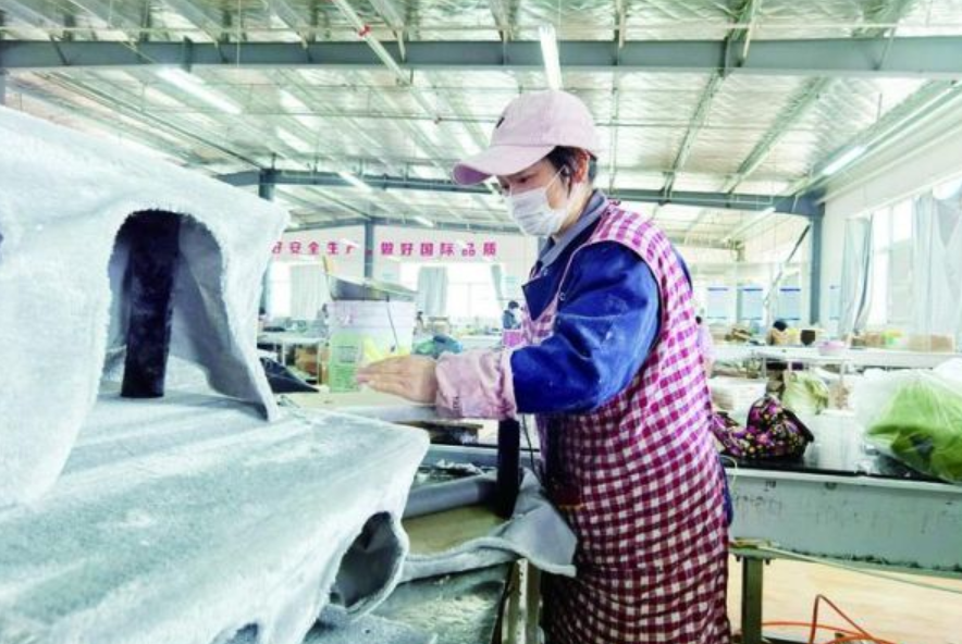 在一条生产线上,杨丽熟练地拿起木框,钉上毛茸茸的灰色布料,一个宠物窝配件就完成了。这样一份操作简单的工作,杨丽已做了2年。靠着这份工作得来的收入,杨丽家摘掉了建档立卡低收入农户的帽子。