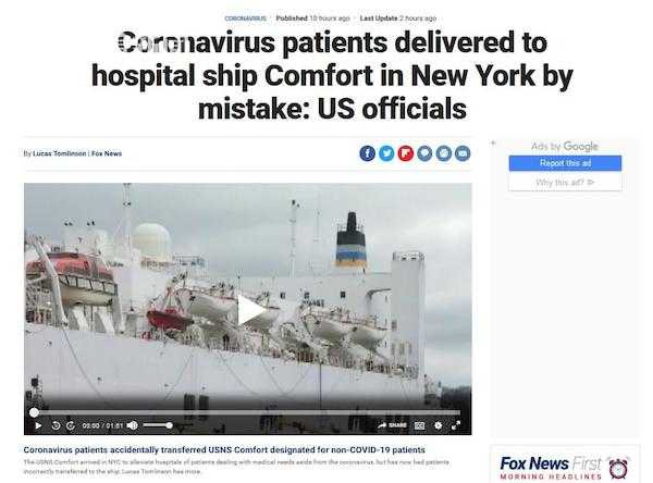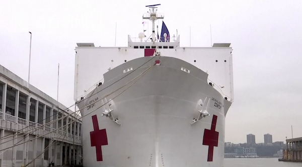 为了让当地医院腾出床位收治新冠肺炎患者,美国海军派出了“安慰”号和“仁慈”号两艘医疗船,每艘能提供1000张床位,用以接受其他病人。其中,“安慰”号前往纽约,但目前只收治了几十名病人。由于无法接收新冠患者,纽约的医院主管人员批评“安慰”号的部署只是一个“笑话”,没能为紧张的医院提供切实的救助。