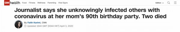 据CNN等外媒报道,美国一名女记者疑似在报道纽约疫情时感染了新冠病毒,她在不知情的情况下 为其母亲举办了90岁的生日派对。目前,参会20余人中已有两人因新冠病毒死亡,另有6人新冠病毒检测结果呈阳性。