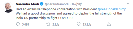 “(我)和特朗普总统进行了广泛的电话交谈。我们的讨论进行得不错,都同意全力部署印美(全球战略)伙伴关系,以对抗新冠肺炎(疫情)。”当地时间4日稍晚时候,莫迪在推特上发布这样一则消息。