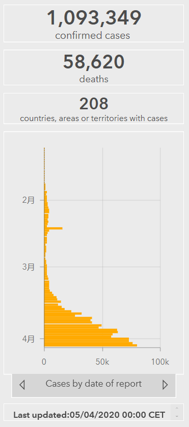 世卫组织实时统计数据显示,截至欧洲中部时间4月5日0时(北京时间4月5日6时),全球确诊新冠肺炎1093349例,死亡58620例,目前全球已有208个国家和地区出现新冠肺炎病例,中国以外约101万例。(总台记者 朱赫)