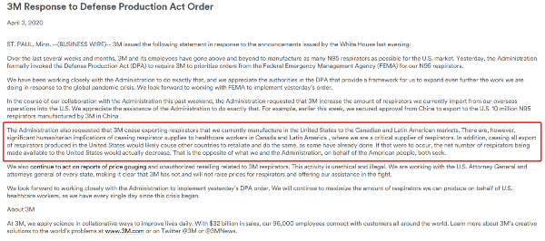 声明指出,3M是加拿大和拉美国家极为重要的口罩供应商,此时切断对这些国家医护人员的口罩供应,会产生严重的“人道后果”。这种做法也可能引起其他国家的报复和仿效,反过来影响美国本土的口罩和其他医用产品的供应。