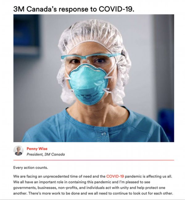 3M公司加拿大区总裁佩妮·怀斯也发表公开信说,“我们将不遗余力,竭尽所能增加加拿大N95口罩的供应,以支持我们的一线医护人员和工作人员。”