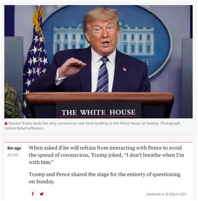 当地时间4月5日,美国白宫举行有关新冠肺炎疫情的新闻发布会,据英国《卫报》报道,当被问及是否会避免与副总统彭斯互动以避免新冠病毒的传播时,美国总统特朗普开玩笑说:“我和他在一起的时候不会呼吸。”