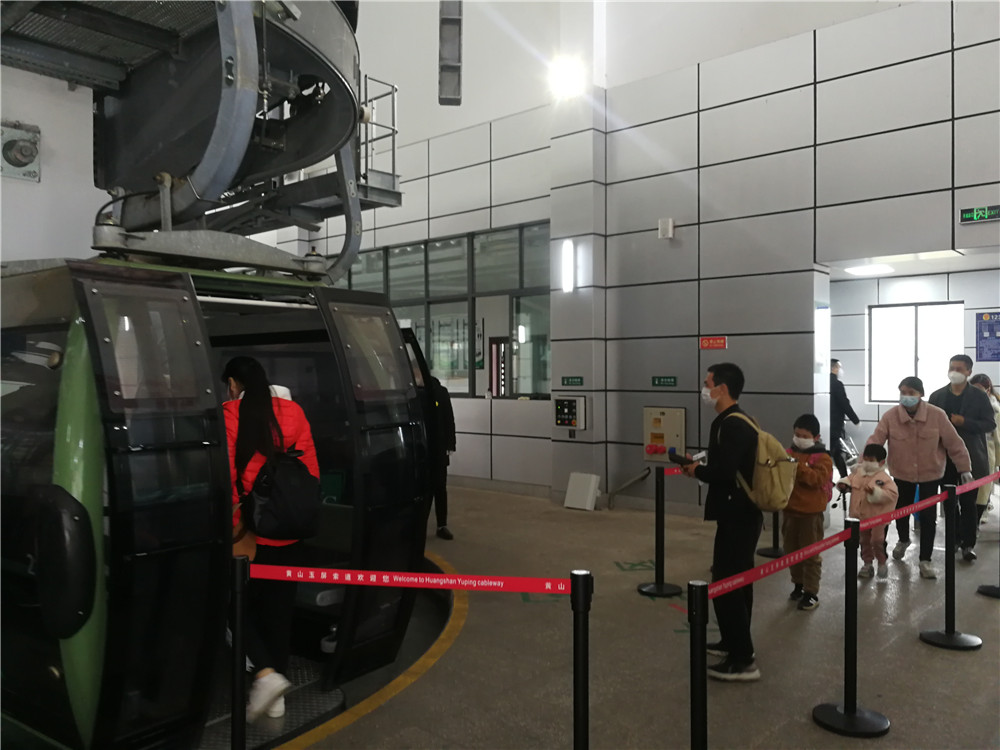 4月6日上午9时,游客佩戴口罩、保持安全距离,有序乘坐缆车 姚文华 摄