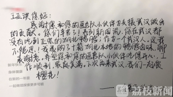 “感谢您和您的医疗队小伙伴为支援武汉做出的贡献,你们辛苦了!看到新闻说您在武汉都没有吃到正宗的武汉鸭脖,作为一个武汉人这我不能忍!我选购十箱湖北本地的鸭脖卤味,聊表谢意。”字条并未署名,落款只写了“一个普通的武汉人”。通过多方打听,记者帮王亚琪视频联系上了寄送鸭脖的武汉人邵女士。