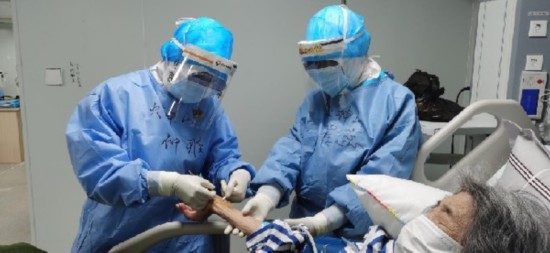 程蕊(右)和队友在护理患者。胡世颉 摄