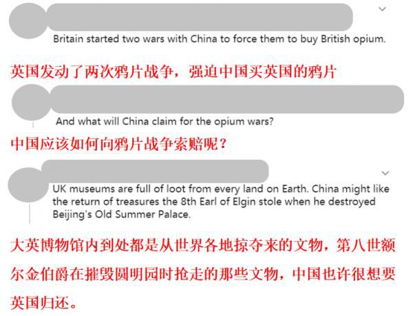 其中,英国在近代对中国发动两次鸦片战争,以及英国在圆明园等地掠夺的文物,更被网友们重点提及。