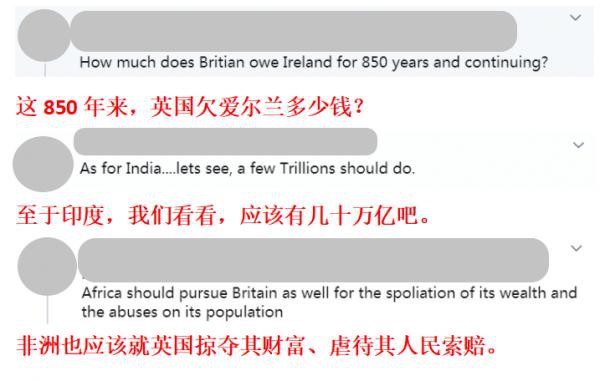 此话题一开,一些来自前殖民地国家和与英国有历史恩怨的国家的网友们纷纷“现身说法”,喊话索赔。