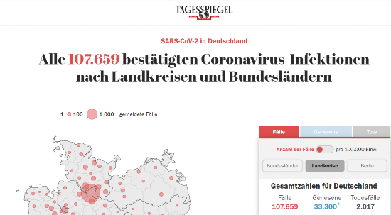 据德国《每日镜报》实时统计数据显示,截至北京时间4月8日7时左右,德国累计确诊新冠肺炎107659例,较前一天新增4284例;累计死亡2017例,较前一天新增207例;累计治愈33300人,较前一天新增4600人。