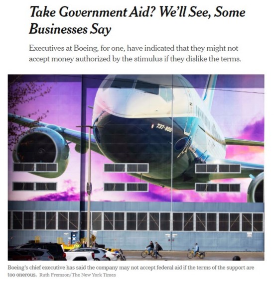 除了拨给小企业的贷款救助,美国政府还承诺将拨给涉及国家安全的大型公司总共170亿美元的贷款。然而《纽约时报》指出,至于大公司是否敢拿,目前“不好说”。报道指出,很多大型公司对贷款条款颇有微词,甚至感到“气愤”。报道援引波音首席执行官戴维·卡尔洪的话表示,该航空公司如果认为政府条款过于强硬,也有可能会通过其他方式筹集资金。在条款中,最令大型企业表示担忧的一条显示,财政部可以要求“受助公司用股票来换取政府支持”。