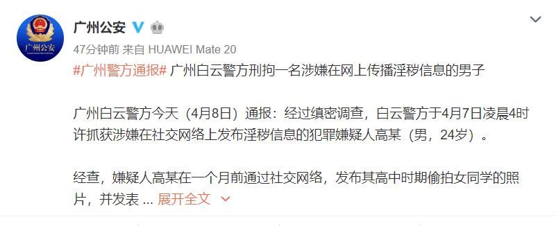 荔枝新闻讯 广州白云警方今天(4月8日)通报:经过缜密调查,白云警方于4月7日凌晨4时许抓获涉嫌在社交网络上发布淫秽信息的犯罪嫌疑人高某(男,24岁)。