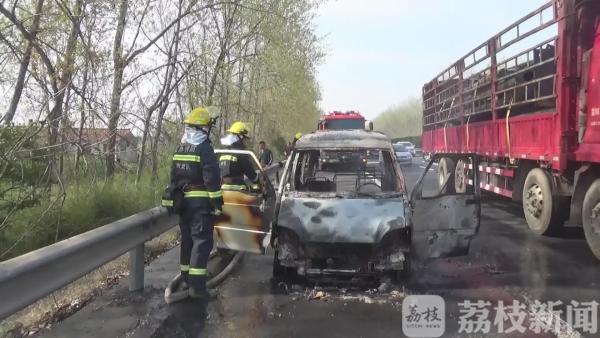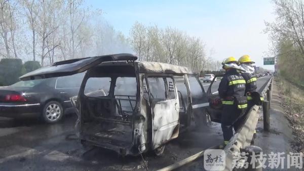 4月7日下午1点40分左右,在扬州市宝应县京沪高速往扬州方向范水服务区附近,一辆面包车发生自燃。当地消防部门接到报警后,立即赶赴现场展开救援。