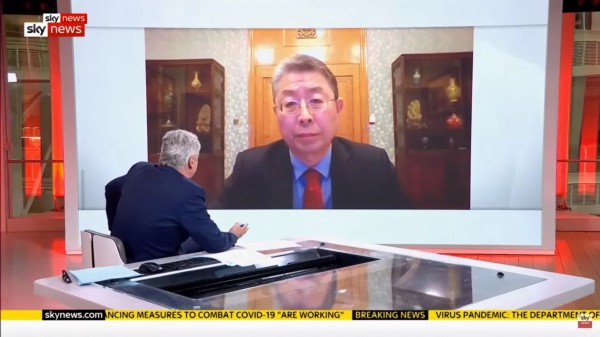 4月6日,中国驻英国使馆马辉公使在接受英国天空新闻台“新闻时间”节目直播连线采访