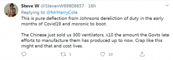 @英国网友:英国政府在转移疫情爆发初期的失职和反应迟钝。我们刚从中国买了300台呼吸机,这是政府后来生产数量的10倍。这样的废话需要停止了,这会令生命付出代价的。