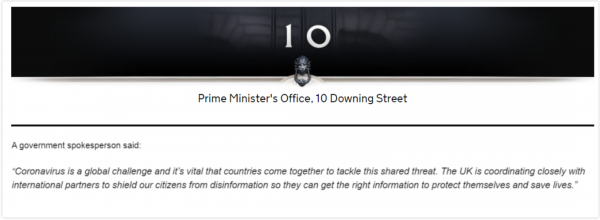 政府发言人:新冠肺炎病毒是全球性挑战,各国齐心协力应对这一共同威胁至关重要。英国政府正与国际各国紧密合作,保护公民免受虚假信息的侵害,使人们获得真实的信息来保护自己,挽救生命。